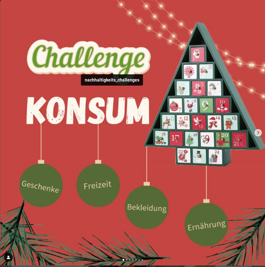 Das Thema Konsum wurde von den N-Challenge Organisator*innen passend zur Weihnachtszeit liebevoll als Adventskalender gestaltet. Jeden Tag war eine neue Anregung für eine nachhaltigere Weihnachtszeit zu finden. Hier seht ihr die Ergebnisse einiger NF-Gruppen im Landkreis Karlsruhe.