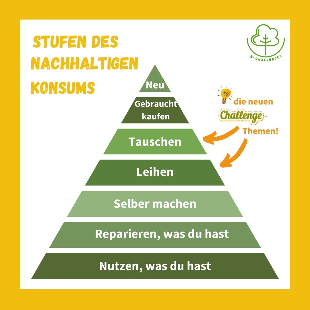 Der zweite Themenbereich der N-Challenges bezog sich auf das Leihen und Tauschen für einen nachhaltigeren Konsum. Nach dem Einstieg in das Projekt mit der Challenge für einen nachhaltigeren Konsum in der Weihnachtszeit fokussierte diese Challenge konkretere Stufen der Konsumpyramide (siehe Abbildung). Die Gruppen beschäftigten sich mit den beiden Alternativen zum weniger nachhaltigen Neukauf und fanden kreative Wege, die Konsumpyramide gemeinsam kennenzulernen.