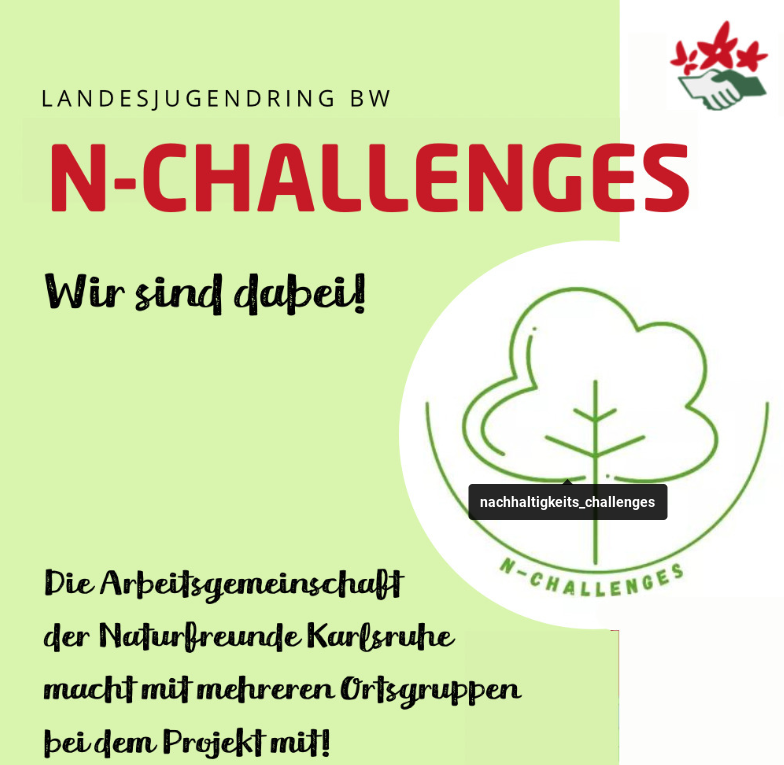 Die Naturfreunde Karlsruhe beteiligen sich am N-CHALLENGES Projekt zur Umsetzung von Nachhaltigkeits-Challenges in der Kinder- und Jugendarbeit und Jugendsozialarbeit, und koordinieren die Aktivitäten verschiedener Ortsgruppen der Naturfreunde aus dem Landkreis Karlsruhe, die an dem Projekt teilnehmen. Zusammen mit der Arbeitsgemeinschaft der Landjugendverbände (AGL BW) erproben wir dabei neue Engagementformen, um nachhaltige Verhaltensänderungen zu fördern.