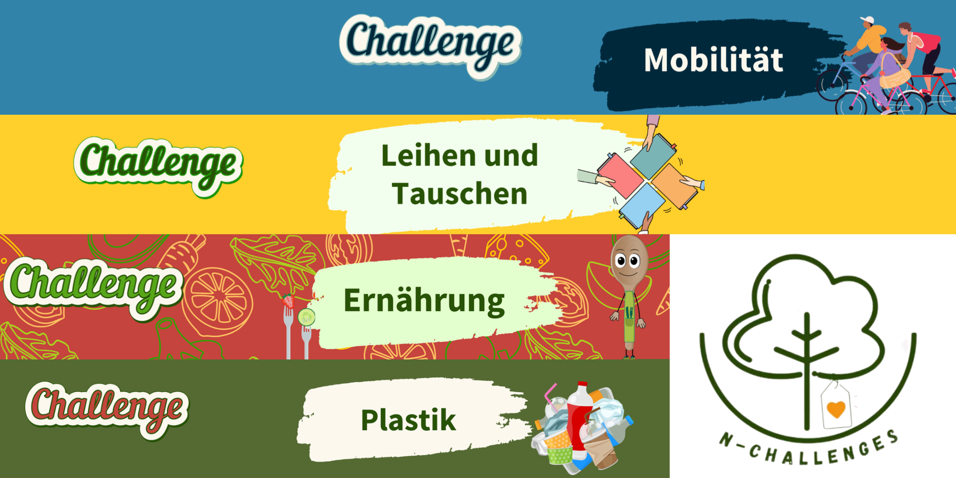 Jede Challenge definiert ein vorgegebenes Thema, wie z.B. Gesunde Ernährung oder Konsum, zu dem in einem bestimmten Aktionszeitraum in einer oder mehreren der beteiligten Ortsgruppen Aktionen mit Kindern und/oder Jugendlichen durchgeführt werden. Auf dieser Projektseite erfahrt ihr mehr über anstehende Challenges, die beteiligten Ortsgruppen, deren Termine und durchgeführte Aktionen.