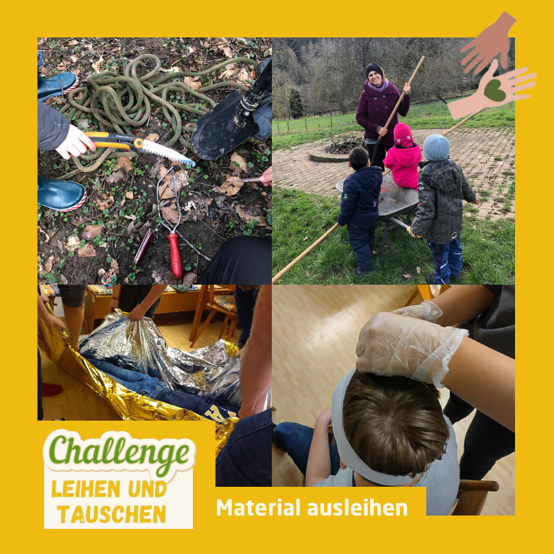 Einige Gruppen entschieden sich dazu, für ihre Gruppenstunden Material von anderen Gruppen oder Personen auszuleihen. Während die Ortsgruppe Berghausen eine Erste-Hilfe-Einheit mit geliehenem Material des Roten Kreuz durchführte, konnte die Gruppe in Birkenfeld ihren Frühjahrsputz mit geliehenen Gartengeräten machen. Auch die Umweltdetektive in Kleinsteinbach, die im Wald erkunden, bauen und spielen, nutzten das Challenge-Thema, um über das Teilen und Ausleihen ihres Werkzeugs zu sprechen. Die Paddelgruppe unserer Ortsgruppe Karlsruhe hat nach den Osterferien außerdem wieder mit ihrem Outdoor-Training begonnen, bei dem die Teilnehmer*innen sich Material wie Paddel und Schwimmwesten vom Verein ausleihen können.