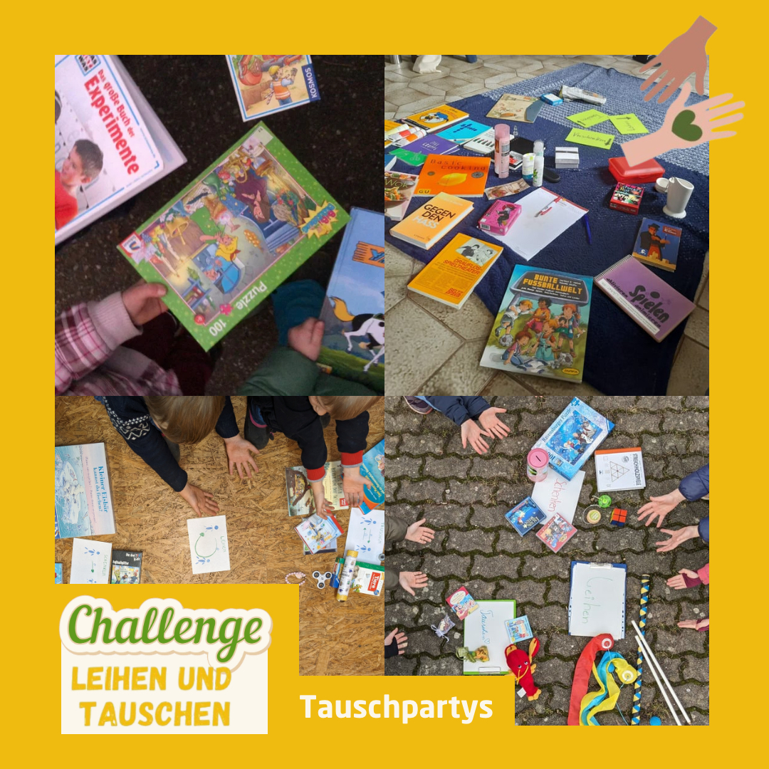 Die Gruppen fanden vielfältige Möglichkeiten, die Stufen Leihen und Tauschen durch interessante Aktivitäten auszuprobieren und nachhaltige Verhaltensweisen zu vermitteln. Einige der Gruppen veranstalteten „Tauschpartys“, bei denen die Teilnehmenden gebrauchte Spielsachen, Bücher, Filme oder ähnliches von Zuhause mitbringen und untereinander tauschen konnten. Bei größeren Spielsachen oder dem Wunsch auf Nutzung von verschiedenen Kindern, wurden auch Dinge zum Gruppenbesitz erklärt, die nun regelmäßig von Kindern ausgeliehen werden können. Solche Tauschpartys fanden bei den Kindergruppen in Durlach, Kleinsteinbach und Grötzingen statt.