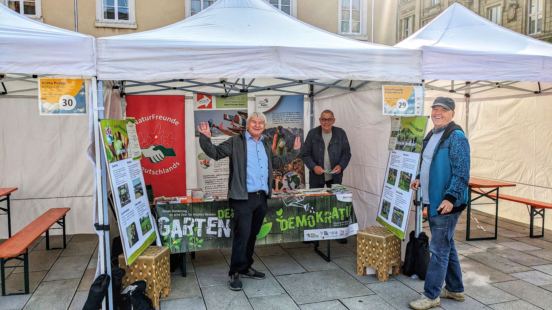 Am 30.09. fand auf dem Marktplatz ein Aktionstag zum Thema "Klima - Natur - Eine Welt" statt. Auch die Naturfreunde Karlsruhe waren am Aktionstag mit einem Stand beteiligt und stellten dort insbesondere den Garten der Demokratie und das Togo-Projekt vor.